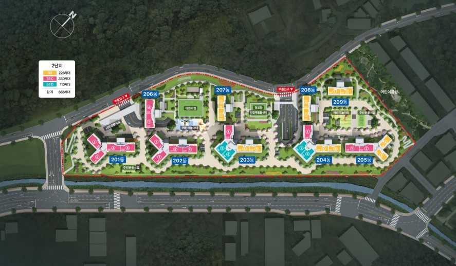 2단지는 도로를 따라 길게 늘어진 형태로 타동과 간섭을 최소화하여 어떤 동 어떤 호수에서도 탁 트인 조망권을
